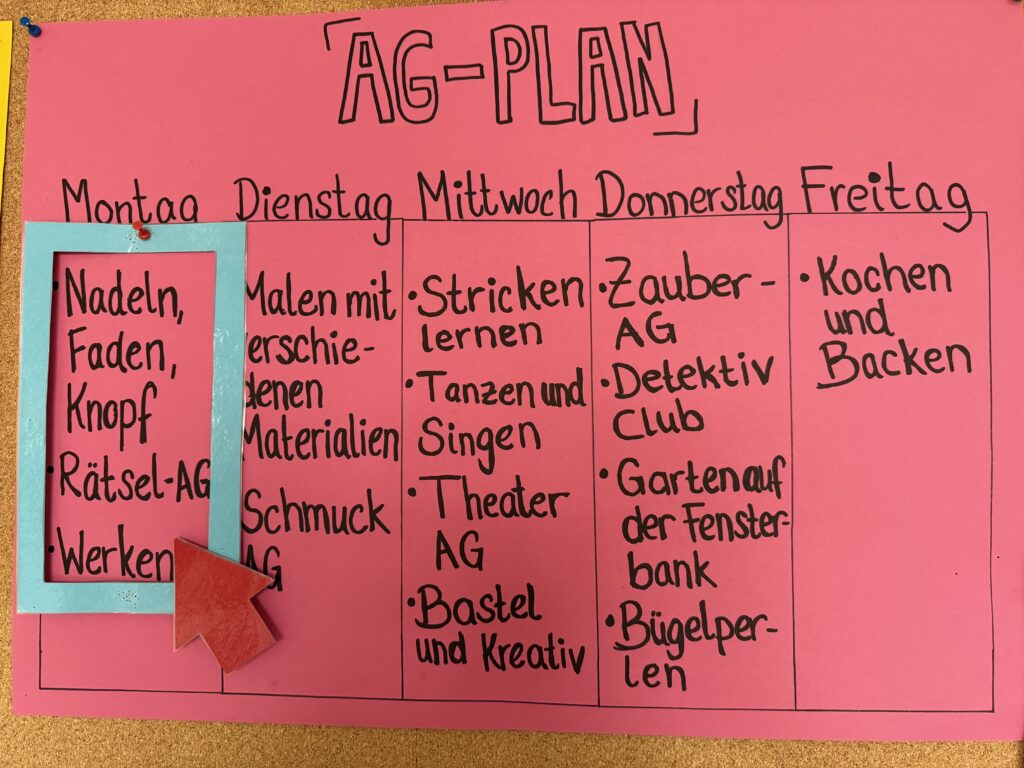 Zum Schluss wurde noch der gesamte Eingangsbereich der OGS umgestaltet. Die Mitarbeiter und der Hausmeister spannten in einer gemeinsamen Aktion Schnüre, um dazwischen Sonnensegel zu spannen, die gegen die Sonne schützen sollen. Eine eigens dafür angefertigte Dekoration rundet das gesamte Erscheinungsbild ab.