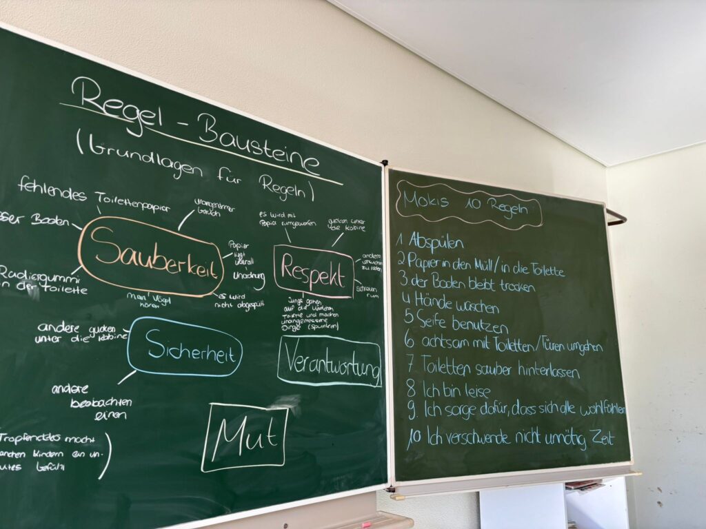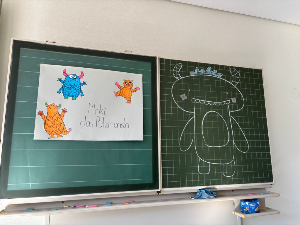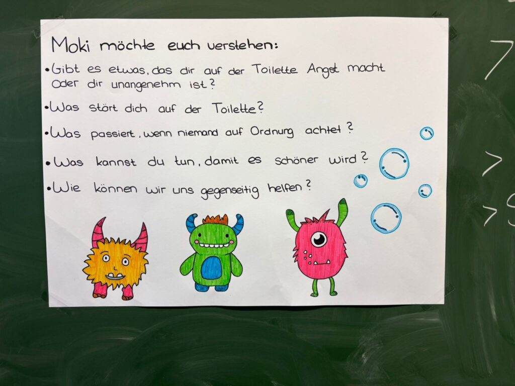Um dieses Problem anzugehen, helfen Kinder aus der OGS der Klassen 1-4 im Rahmen des Projektes „Moki, das Putzmonster“, die Schultoiletten zu einem sauberen Ort zu machen, an dem sich alle Schüler*innen wohl fühlen.