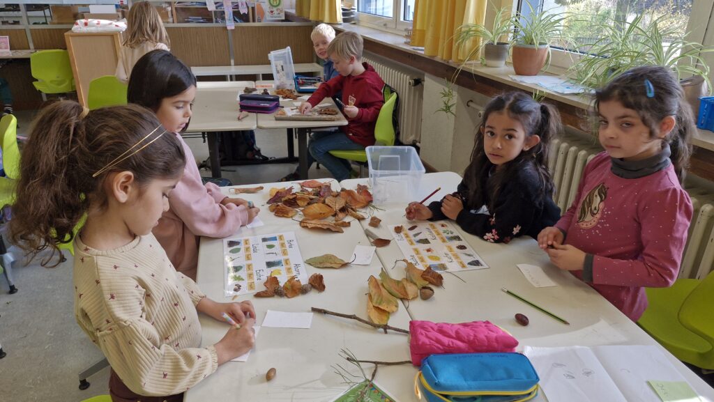 Die Klasse 1b hat fleißig Blätter und Früchte gesammelt, sortiert und herausgefunden, von welchem Baum sie gefallen sind.